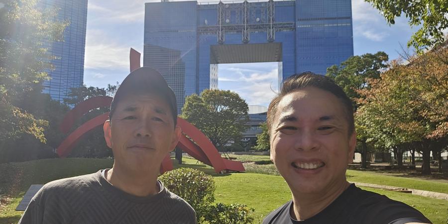 Photo taken with Taka at the Smile Garden with the Telecom Center Building in background. Ariake area is made up of many islands with nice parks